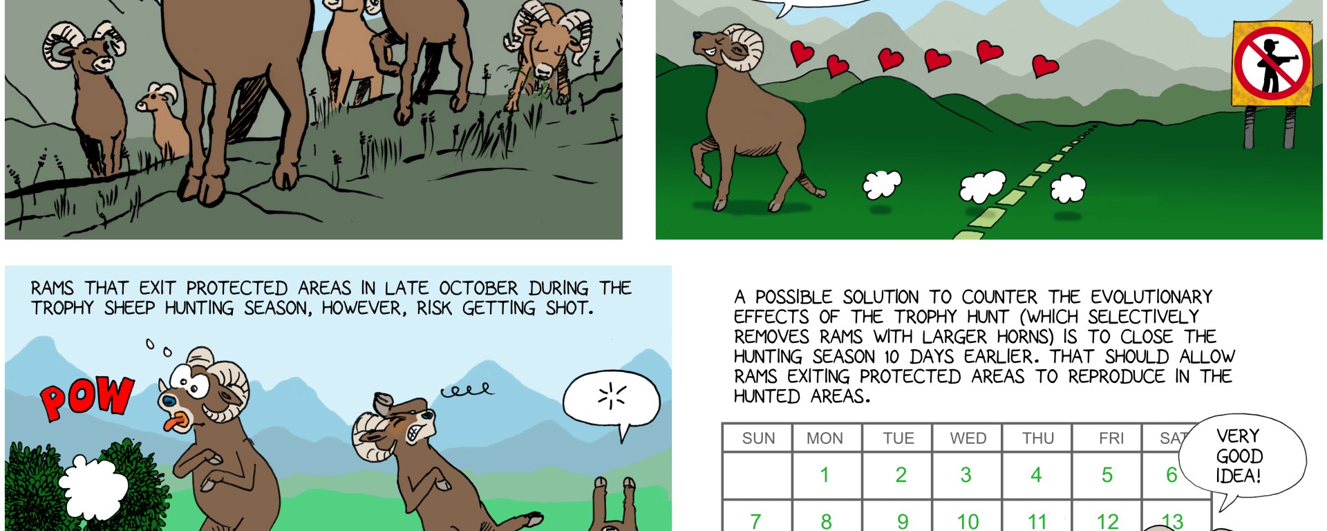 In their new research, Testing the importance of harvest refuges for phenotypic rescue of trophy‐hunted populations, Poisson and colleagues explain why closing hunting seasons earlier could be vital to the future of bighorn sheep. This illustration by Benoît Leblanc summarises the key implications of their work.