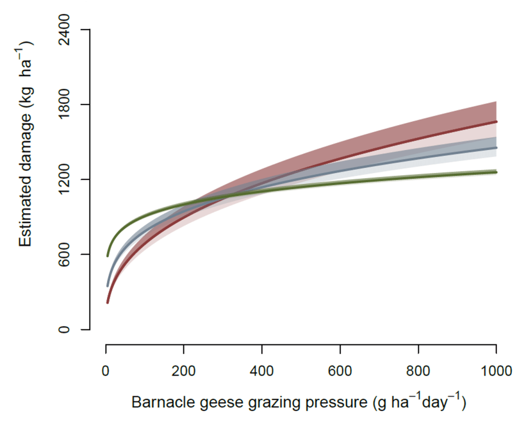 The relationship also depends on the presence of other goose species, with highest damages occurring when there are only barnacle geese on a field. In the region we studied, white-fronted and greylag geese have little effect on the assessed losses to spring harvests. This is likely because these species start their migration to the breeding grounds much earlier than barnacle geese and well before the time of first harvest.