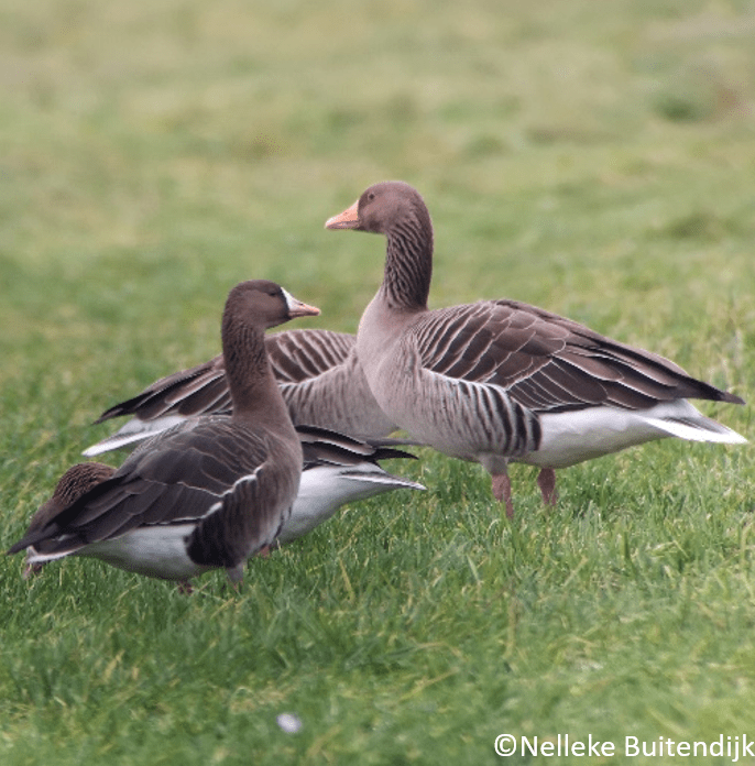 We also see that large flocks of barnacle geese do not occur together with large numbers of white-fronted and greylag geese. This is likely because the species have different food preferences. Barnacle geese have a small bill, and can easily handle short grass, which is more difficult for the two larger species. However, the larger white-fronted and greylag geese have the benefit of a longer digestive tract, which helps to digest tough foods avoided by smaller species. This means that an area suitable for one goose species may be unattractive to another.