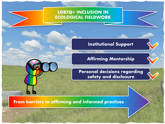 As a team, we would like to acknowledge that this work is just one step down a path started by others, and we look forward to more recommendations, solutions, and actions that increase inclusivity and accessibility within this field. And to early-career field ecologists who are LGBTQ+: We want you to know that you belong in ecology, we are grateful you are here, and progress is happening. We can’t wait to hear your stories of adventure and fun in the field.