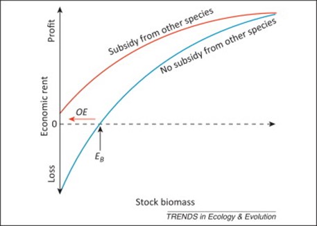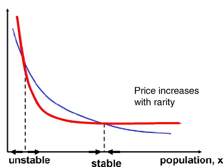 As the hunter exploits more and more of the population, however, it can become harder to find and locate individuals, driving up the cost of harvest. As a result, so long as the market value of the species stays the same, the hunter wouldn’t want to deplete a population below a certain size, since they would start losing money.