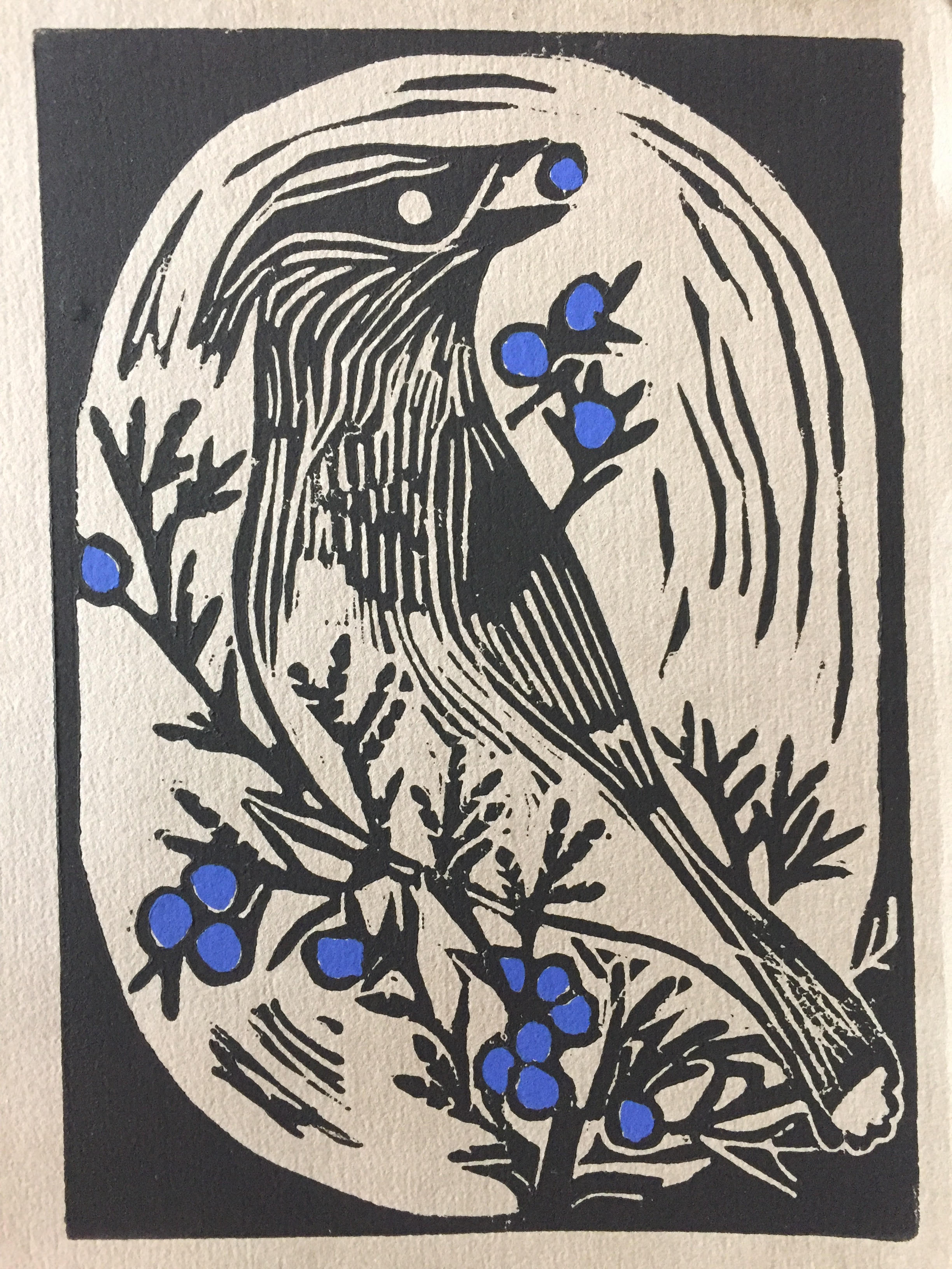 Blockprint of a Cedar Waxwing © Claudia Christensen García