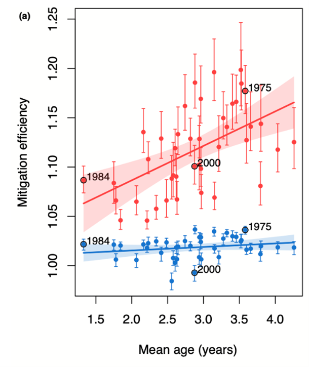 Importantly, the mitigation efficiency will be higher if the stock has a higher mean age (Fig.3 and in those occasions, fishing reductions of moderate intensity applied between 1 and 4 years would allow to increase catches with only a slight increase in interannual variability.