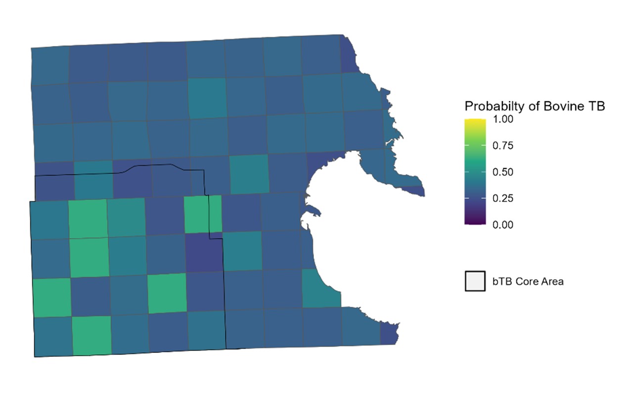 The Michigan Department of Natural Resources can use these maps to determine what areas are good candidates for increased numbers of deer hunting permits to reduce bovine TB spread and target sites for trials of deer vaccination. The state’s Wildlife Risk Mitigation program can use our results to prioritize which cattle producers could most use a deer fence around their property.