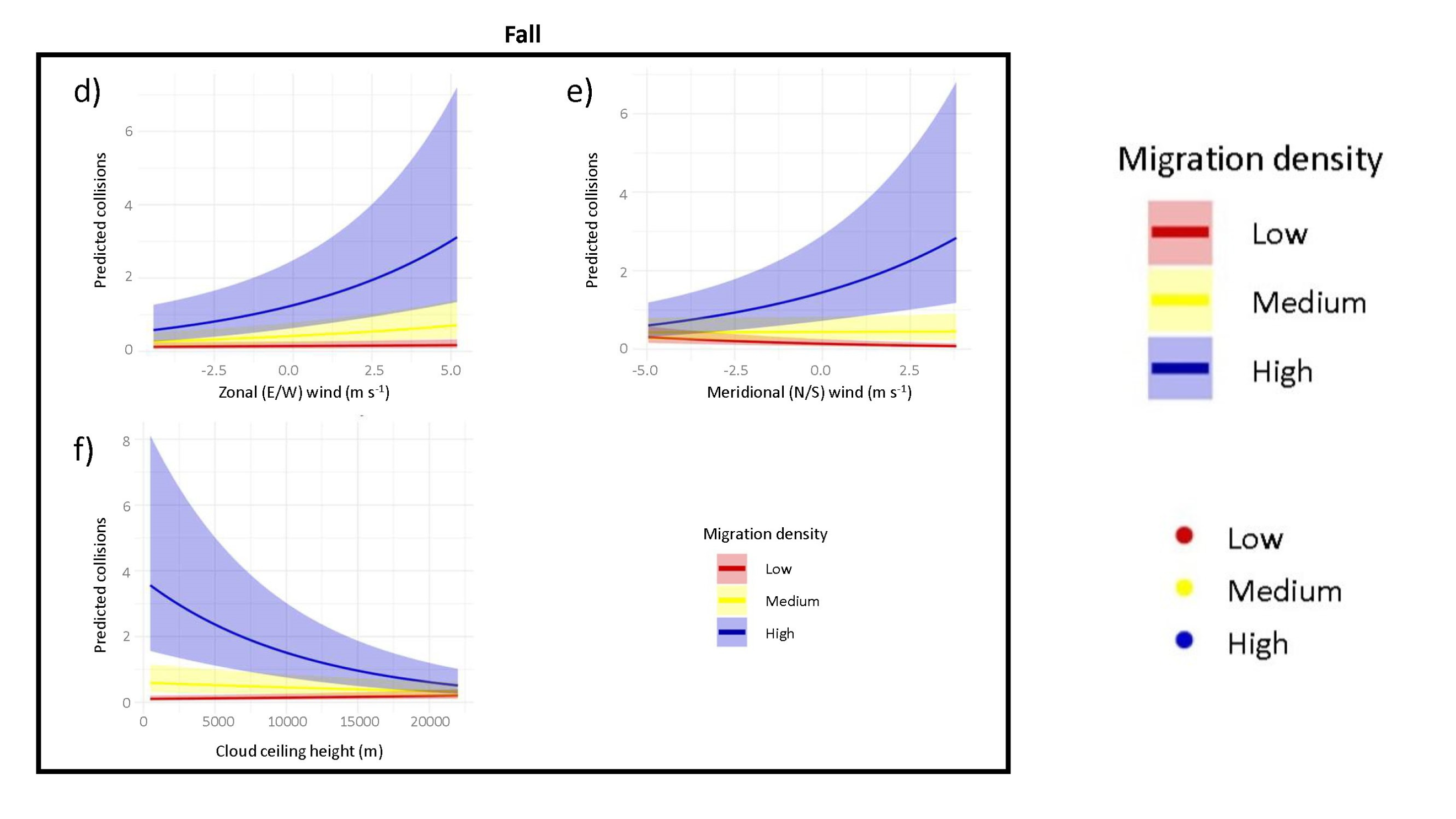 Our analyses indicate that weather conditions combined with migration traffic patterns are important predictors of bird collision risk. Generally, bird collision rates were higher when there was more migration traffic in the region, but this was affected by weather too. We found that nights with headwind conditions for migrating birds and winds that blew birds toward the coastal city had higher numbers of window collision victims, and that visibility also played a role. We found higher collision counts to be associated with winds coming from the North and the West in spring and with winds coming from the South and West winds in fall.