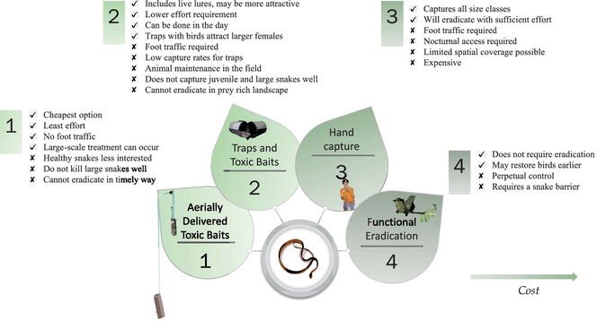 A pathway was developed that allowed for snake suppression sufficient enough to observe an increase in activity of birds in the control area, provided the area was surrounded by a snake-exclusion barrier. The approach also identified that using live birds as a form of control, although expensive, was essential if bird recovery was the desired outcome. This finding was somewhat contradictory towards prior opinion that birds should not be used as control tools because mice are less expensive and remove equal numbers of snakes, challenging previously established wisdom on best practice approaches to snake control.