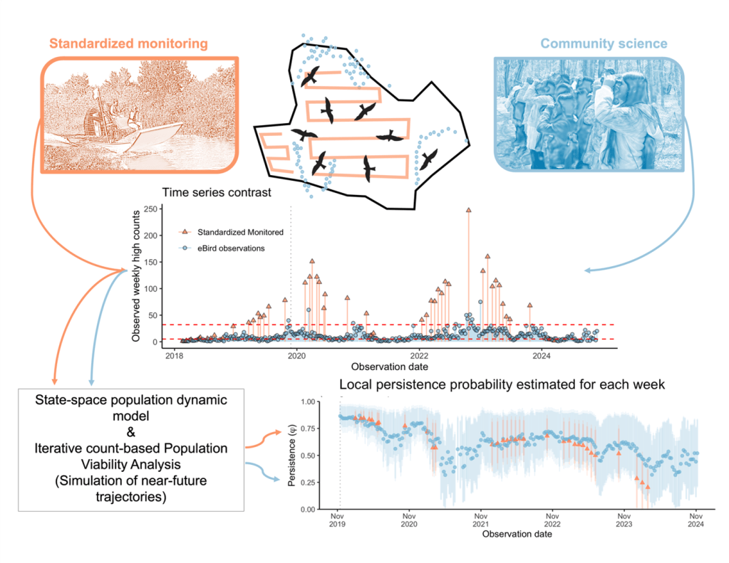 Esperábamos que los datos de eBird, una plataforma de ciencia comunitaria, presentaran una mayor variación en el proceso de observación que el proyecto de monitoreo estandarizado que se estaba llevando a cabo en los mismos sitios. No obstante, también evaluamos si la dinámica temporal de los conteos podría reflejar la dinámica general de la población, aunque no con una precisión perfecta. Ajustamos modelos avanzados para describir la dinámica de la población, utilizando las estimaciones de los parámetros del modelo para simular las trayectorias futuras de la población de forma independiente en los dos conjuntos de datos. Este enfoque se llevó a cabo de forma iterativa durante un monitoreo de la población de 5 años.