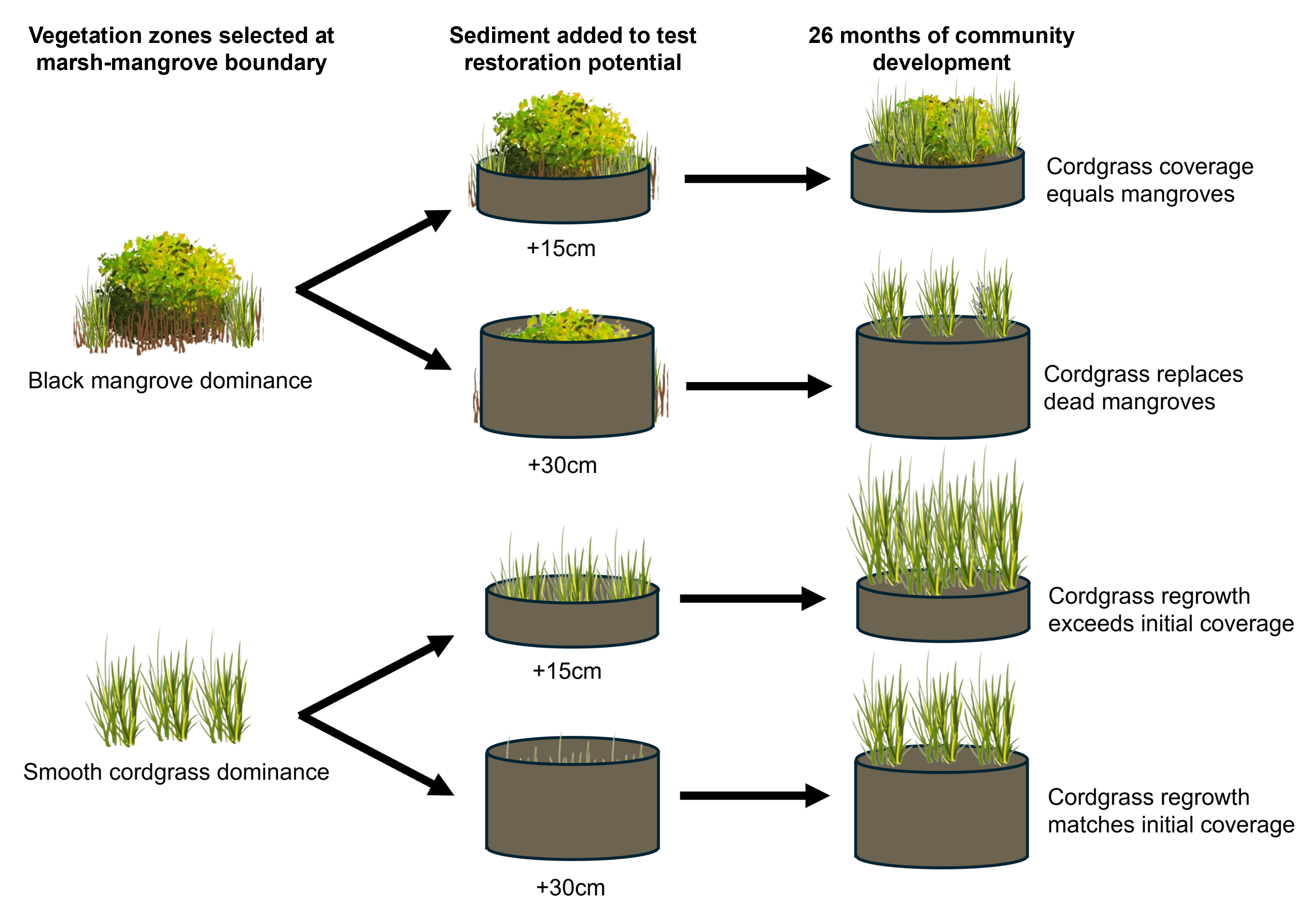 Buried smooth cordgrass recovered from burial and even benefitted from thinner (+15cm) additions of sediment. In contrast, buried black mangroves declined over time, with smooth cordgrass reclaiming areas where mangrove cover was lost. These outcomes suggest that sediment addition could shift wetlands transitioning to mangrove forest back to saltmarshes. However, we also found that new mangroves (established from seeds) preferred to take root in the higher, drier soils created by sediment addition, indicating that mangrove loss would likely be temporary.